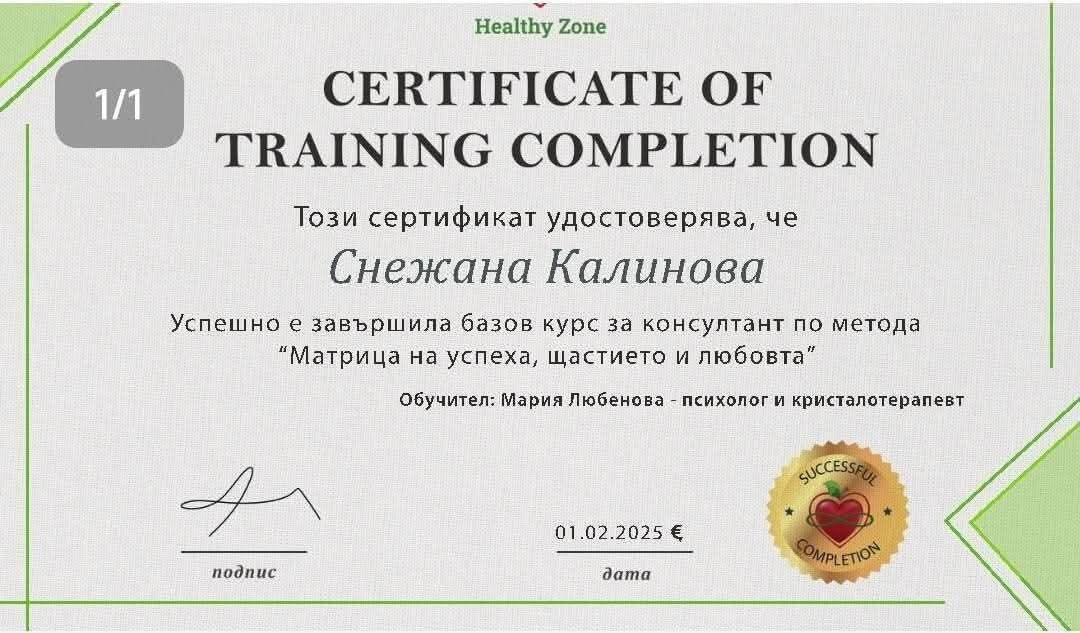 *неограничените ви възможности, потенциали и предназначения.Чрез специален софтуер се изчислява личната Матрица на всеки човек и от нея се вижда какви скрити послания относно постигането на изобилие и удовлетвореност във всички сфери в живота са му заложени още от раждането.Основните направления, които се разглеждат в анализа са следните:Човешка същност - тя дава информация за нашите уникални заложби и качества, които трябва да проявим в нашия живот, за да живеем пълноценно. Много често хората се чувстват като изгубени, откъснати от себе си, незнаещи какво искат. Припомняйки си нашата автентичност, ние започваме да действаме и по един нов начин, и предизвикваме случването на поредица от благоприятни за нас синхроничности в живота си, които ни водят към успешното реализиране на нашето предназначение в живота.Помощ от Вселената - това са сферите в нашия живот, в които нещата ни се получават с лекота и дори често резултатите надминават първоначалните ни очаквания. Това е така, защото именно в тези дейности ние имаме силната подкрепа на Вселената.Работа, здраве, финансови доходи и взаимоотношения - тези аспекти от живота ни са изключително важни, за да живеем пълноценно. Чрез анализа на ,,Матрицата на успеха‘‘ ние разбираме кои са най-благоприятните сфери за реализиране на уникалните ни заложби, начините по които да действаме, къде да работим и кои са най-подходящите професии за нас, за да увеличим притока на пари и материално благосъстояние в живота си.Дълг към хората - дава информация за непрекъснатия енергиен обмен, в който се намираме с всичко и всички хора около нас.Какви ще са ползите за Вас от анализа:🌟Опознаване, разбиране и приемане на себе си.